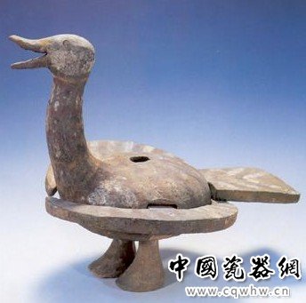 夏商周时期,人们更多地将艺术创造的才能投向青铜器的制作上,忽视陶瓷制作。这件陶鸭正是在这种历史大背景下创造出来的为数不多的精美陶器工艺品之一。它的头与身部采用写实表现手法,而衔接上的双翅、尾与双足则省去细节采用了几何形的抽象表现手法。抽象与具象的结合,形成了简与繁的对比,使陶鸭引颈鸣叫的主题更加突出。