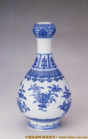 青花蒜头瓶(清乾隆):高8.5厘米,为故宫宝藏。乾隆官窑曾盛兴过“仿生釉”,所仿材料酷肖,虽然艺术格调不高,但为数有限,受到收藏家们的关注。